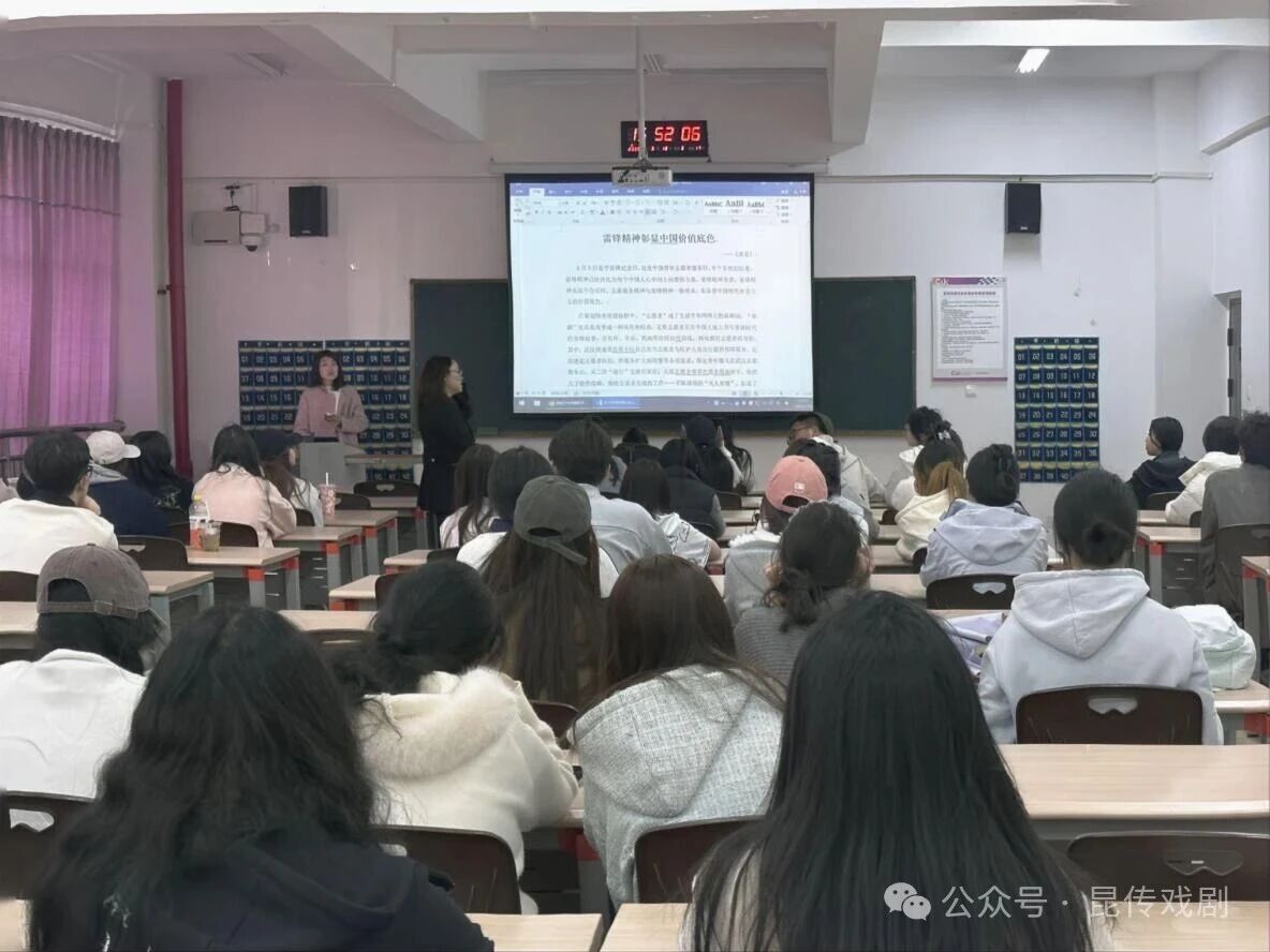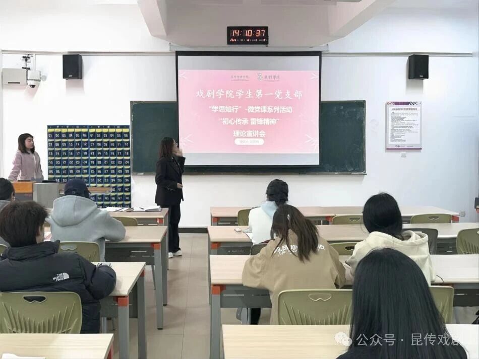 随后,戏剧学院学生第一党支部组织委员刘艳梅同志继续讲述微党课,她围绕雷锋精神核心要义阐释,向学生解读新时代雷锋精神的践行要求,推动“服务人民、助人为乐、爱岗敬业”的雷锋精神在学生心中具象化。她还结合戏剧专业特色,鼓励同学将雷锋精神融入角色与舞台,用艺术语言传递奉献与担当。宣讲会气氛热烈,师生聆听记录、互动交流。