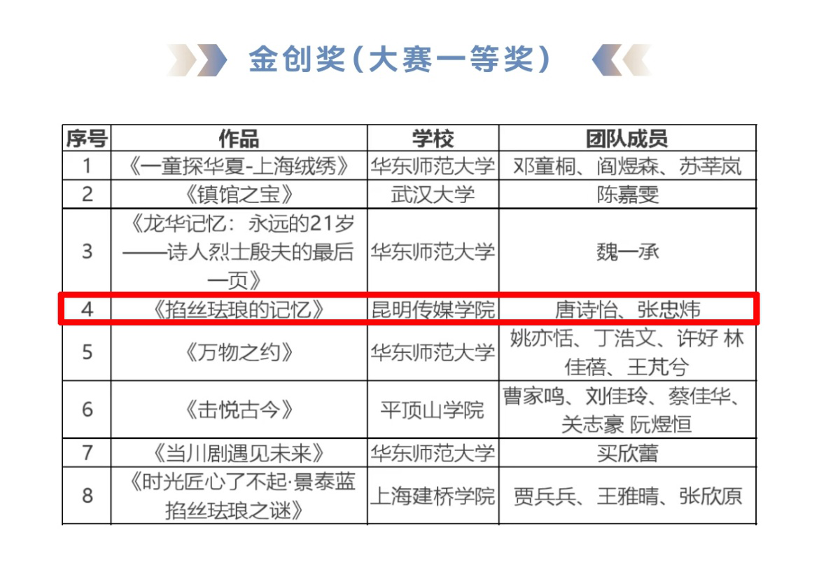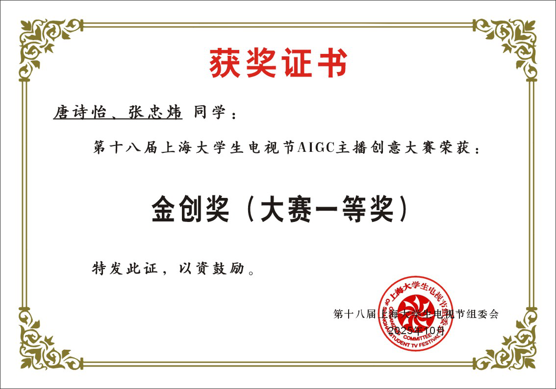 近日,第十八届上海大学生电视节AIGC主播创意大赛获奖名单正式公布。由我院2024级播音与主持艺术专业学生唐诗怡、张忠炜创作,专业教师崔博文指导的作品《掐丝珐琅的记忆》,荣获大赛最高奖项金创奖(一等奖)。