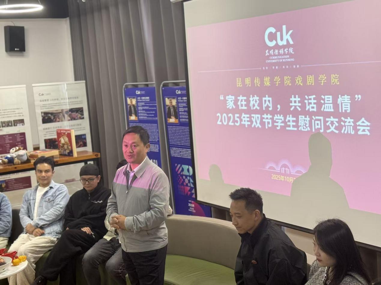 昆明传媒学院党委副书记、副校长李劲与戏剧学院领导、辅导员一同与假期在校学生面对面交流,送上节日问候与关怀。